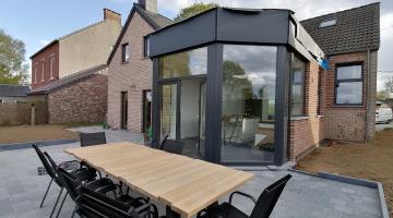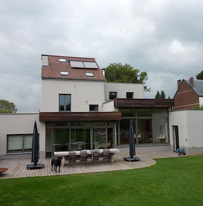 L'habitation existante est agrandie vers le jardin par deux volumes vitrés. De niveaux différents, ceux-ci s'intègre aux volumes existants à toiture plate. L'ensemble forme un tout uni par l'enduit clair.